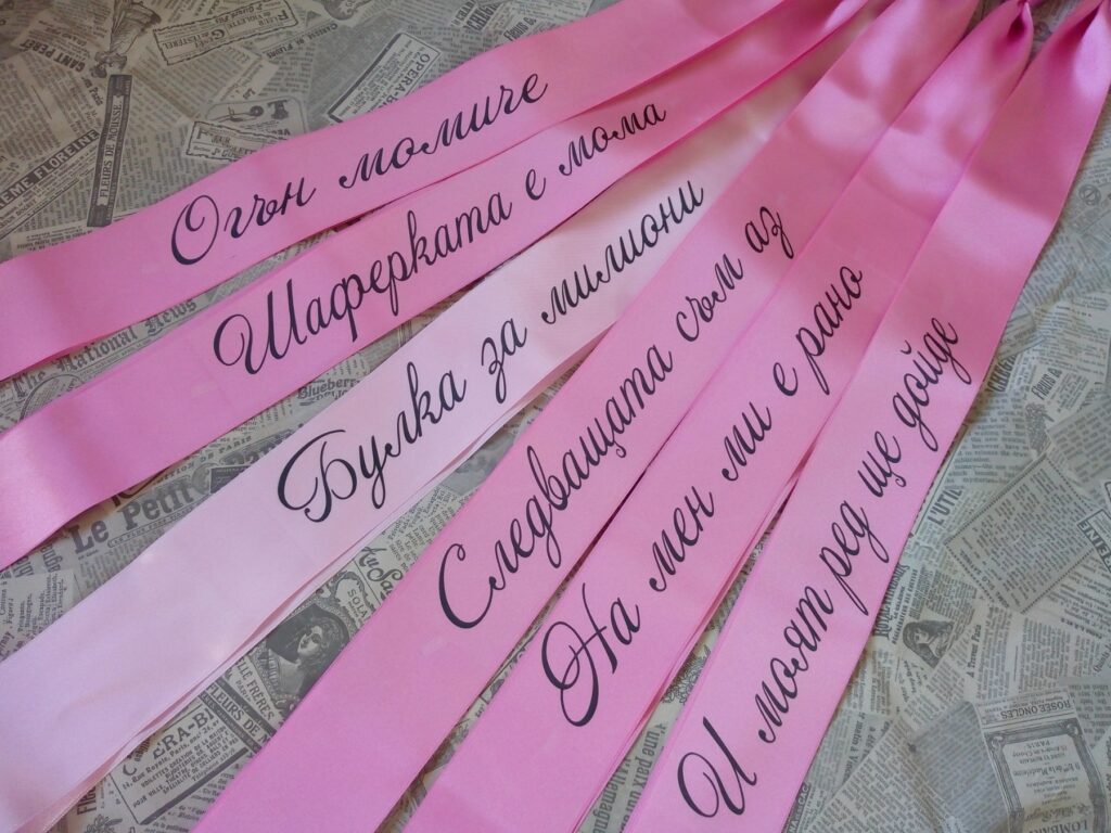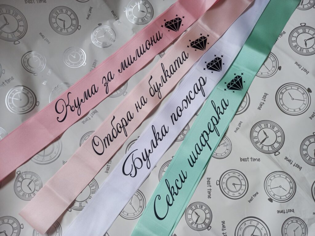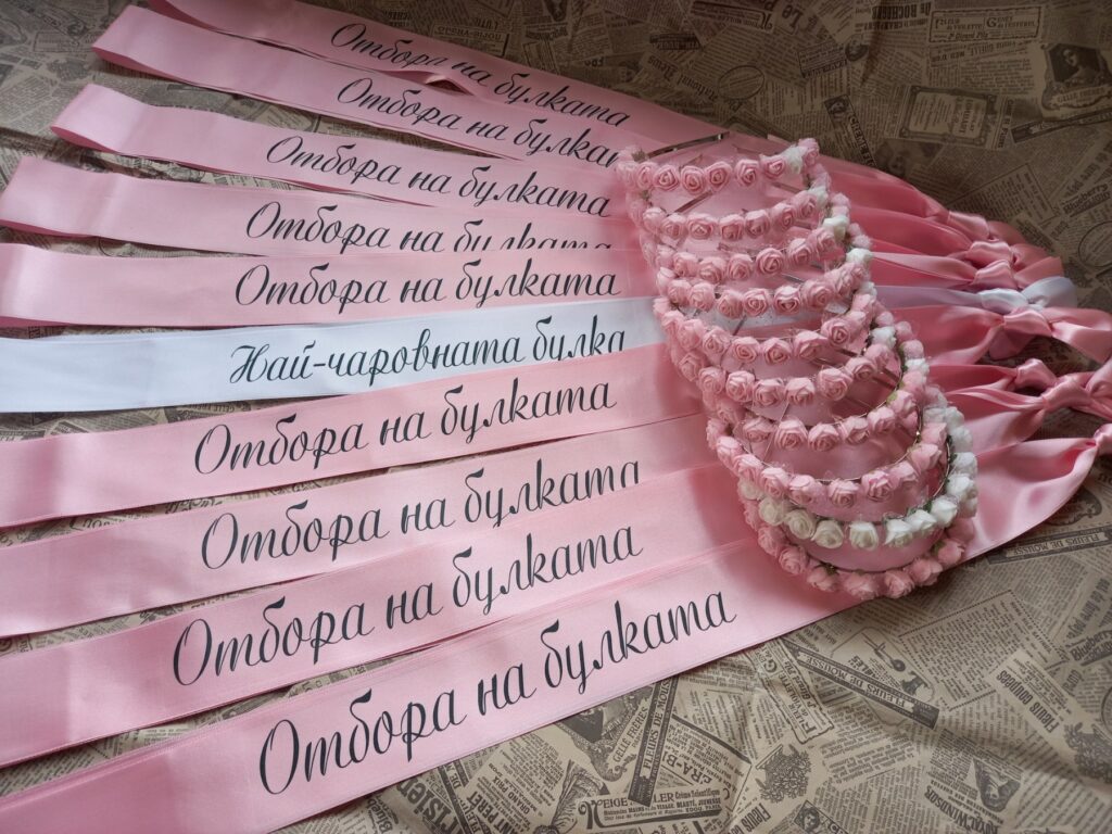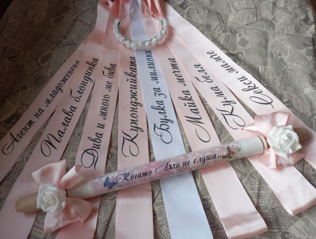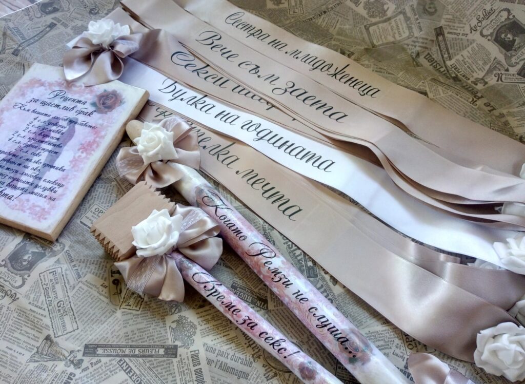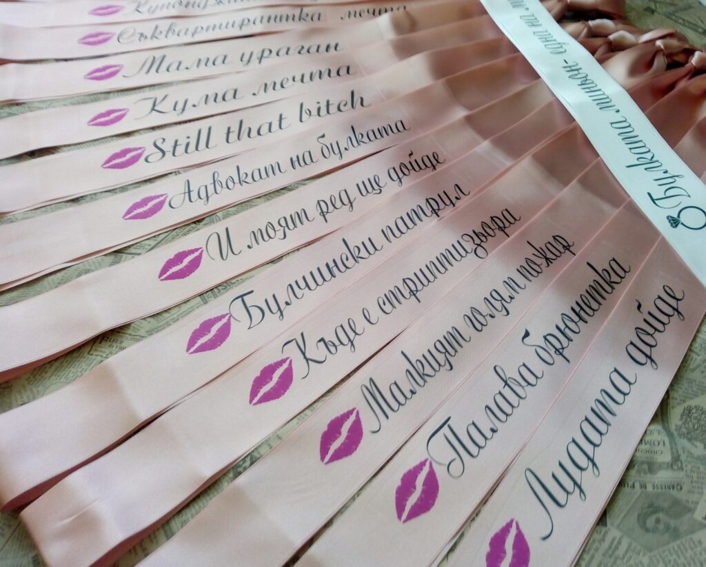 Щастливи сме, че вече над 5 години сме част от Вашите специални събития! Тук може да видите част от аксесоарите, които сме изработили – високо качество ленти от сатен за моминско и ергенско парти, за абитуриентски балове, за детски градини. Може да разгледате комплектите, които изработваме, включващи дъска, чаши за шампанско, банери, момински клетви, както и персонализирани подаръци за младоженци.