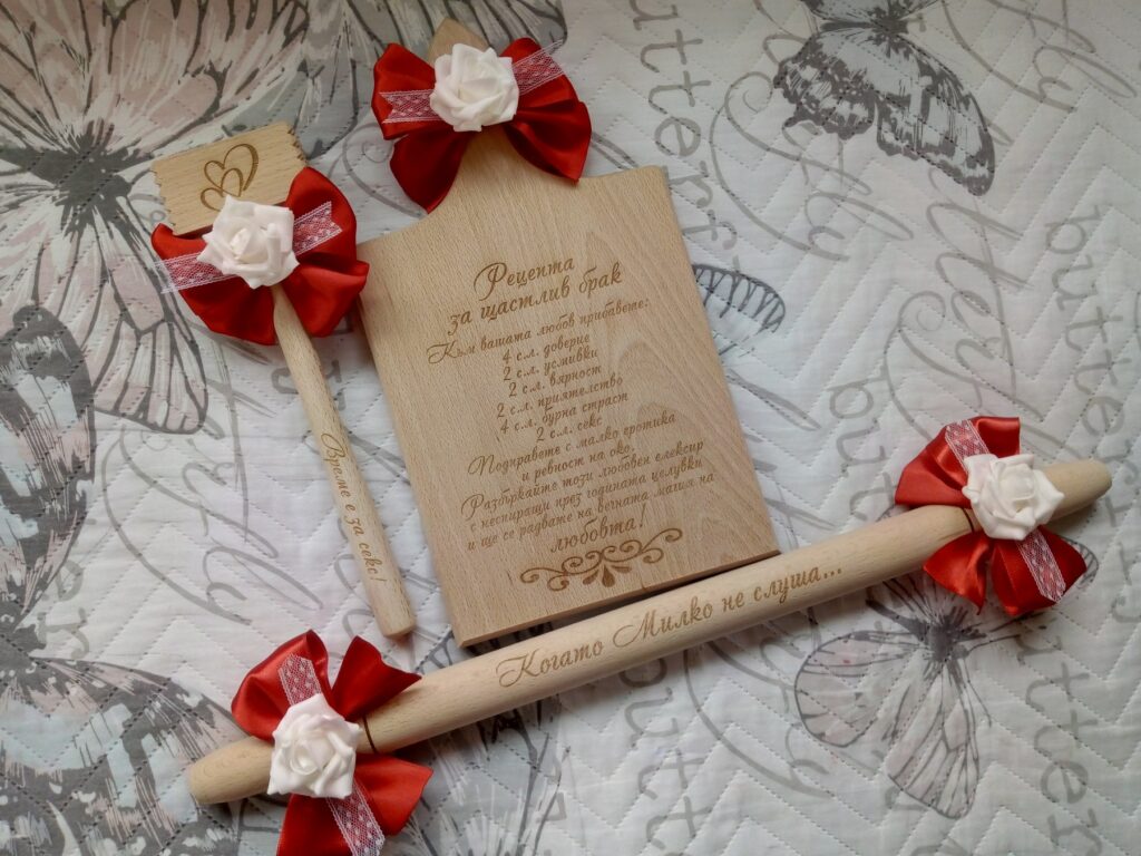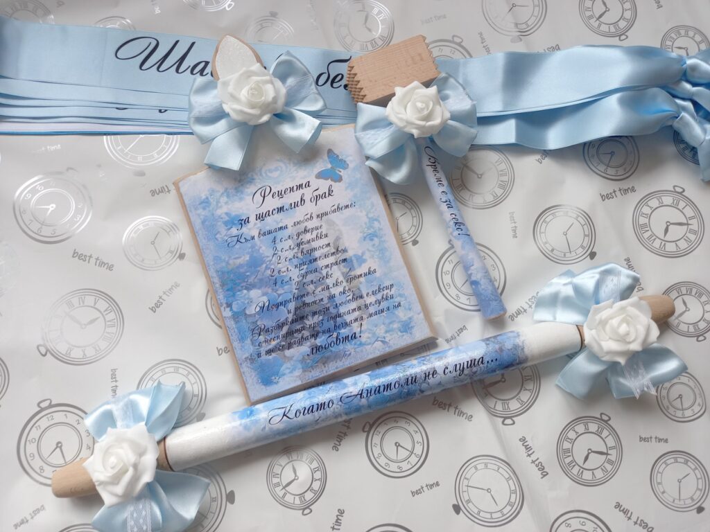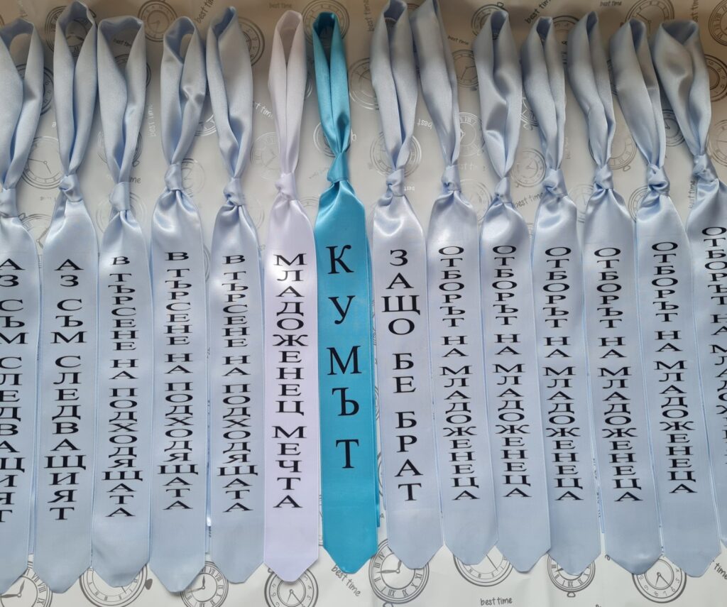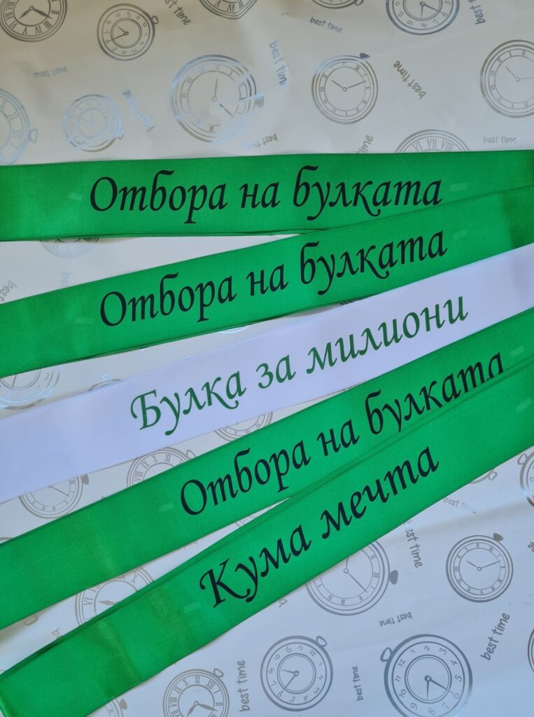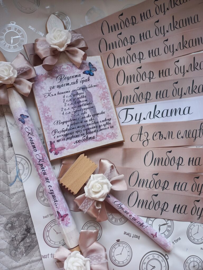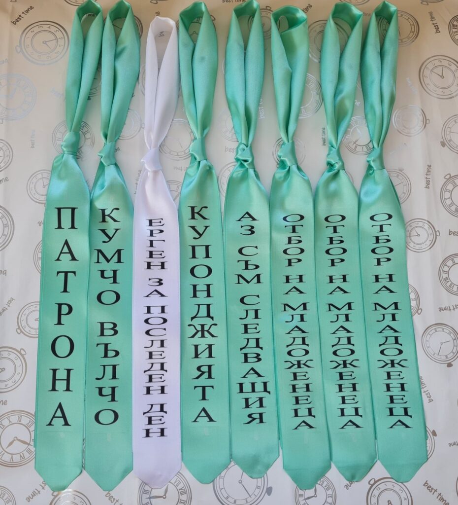 Щастливи сме, че вече над 5 години сме част от Вашите специални събития! Тук може да видите част от аксесоарите, които сме изработили – високо качество ленти от сатен за моминско и ергенско парти, за абитуриентски балове, за детски градини. Може да разгледате комплектите, които изработваме, включващи дъска, чаши за шампанско, банери, момински клетви, както и персонализирани подаръци за младоженци.